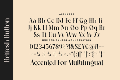Its clean structure allows for versatility, while the slight quirk in its letterforms ensures your design feels unique and elevated. Refresh Button reinvents classic serif style for a new generation of creators.